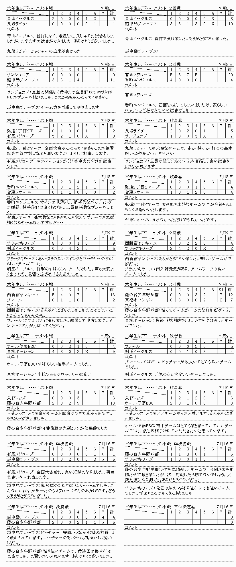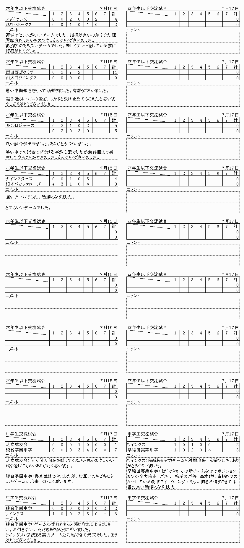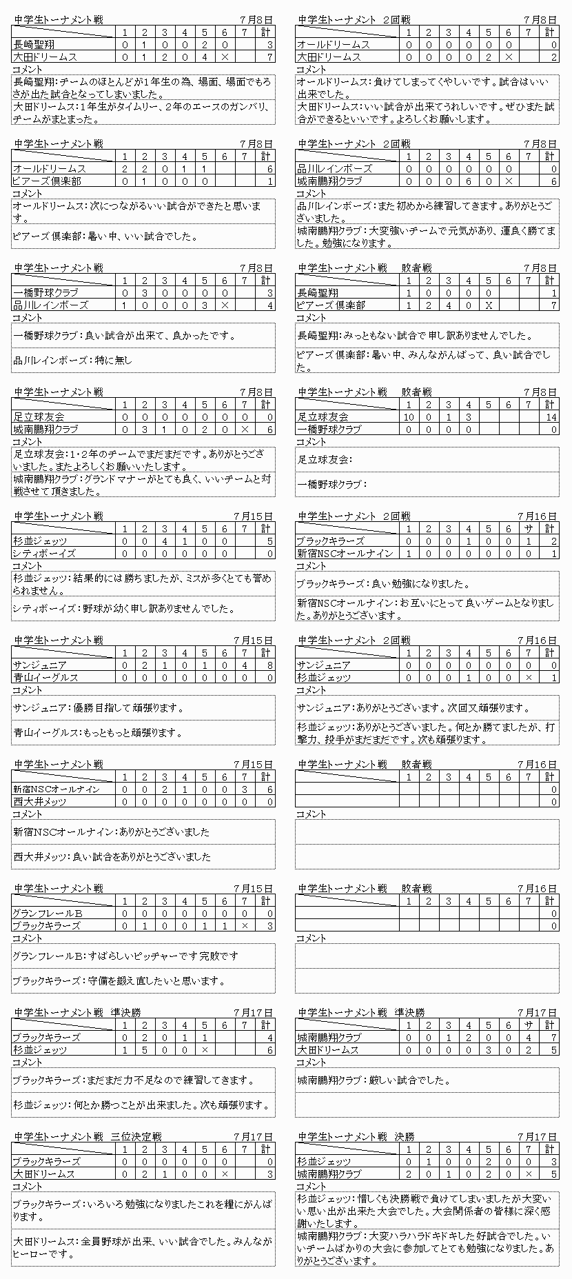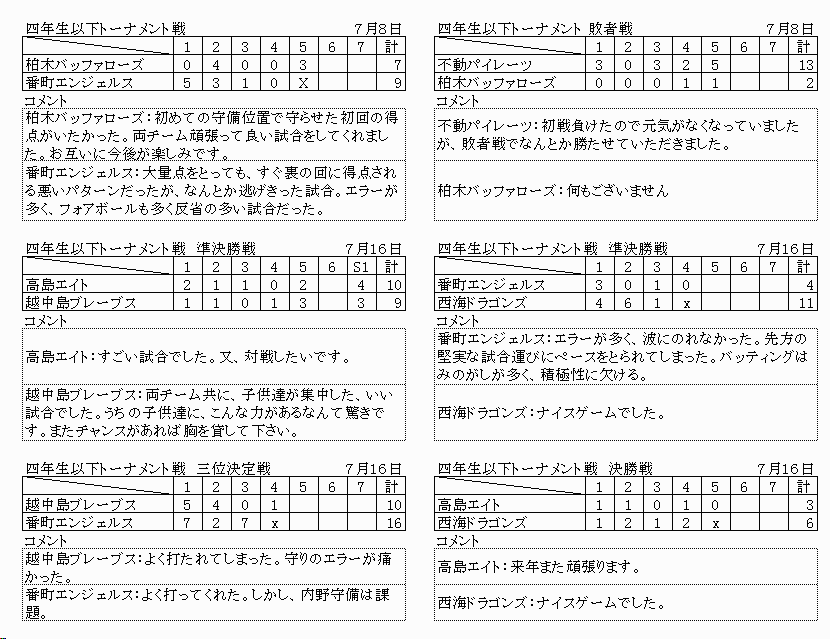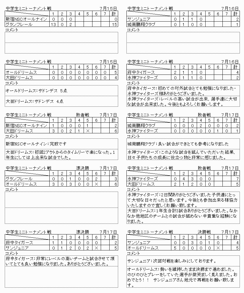 7月15日(土)6年生以下 足立区千住新橋G ナインスターズ(世田谷区) リトルロジャース(台東区) 西大井ウインズ(品川区) いちがやチーターズ(新宿区) 西田野球クラブ(杉並区) カバラホークス(足立区) 浅草ビーバース(台東区) サンジュニア(台東区) レッドサンズ(文京区) 7月17日(祭)4年生以下 足立区千住新橋G 糀谷イーグルス(大田区) 浅草ビーバース(台東区) L Cジュニア (台東区) 西大井ウインズ(品川区) 小金井アトムズ(小金井市) いちがやチーターズ(新宿区) 有馬スワローズ(中央区) カバラホークス(足立区) 7月17日(祭)中学2年以下交流戦 大井埠頭中央海浜公園スポーツの森グランド 早稲田実業(国立市) 駿台学園中学(北区) 足立球友会(足立区) ウイングス(台東区) |